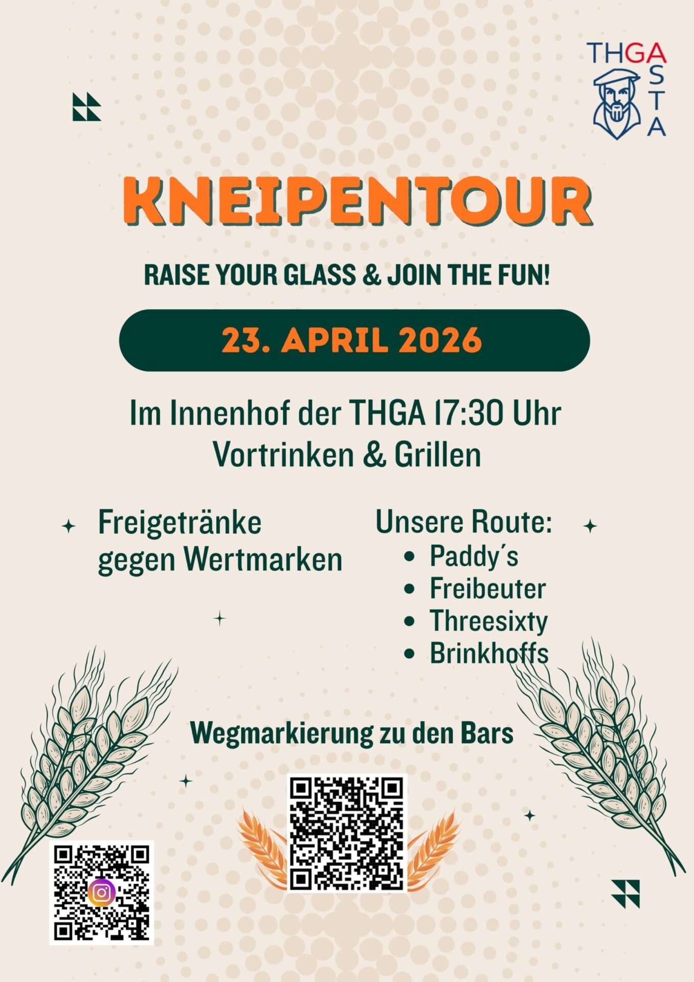 Kneipentour Im Sommersemester laden wir herzlich zu unserer Kneipentour am 23. April 2026 ein. Der Abend beginnt um 17:30 Uhr mit einem gemütlichen Grillen im Innenhof der Universität. In entspannter Atmosphäre und mit einem kühlen Getränk stimmen wir uns gemeinsam auf den weiteren Verlauf des Abends ein. Im Anschluss ziehen wir weiter zu ausgewählten Bars, […]